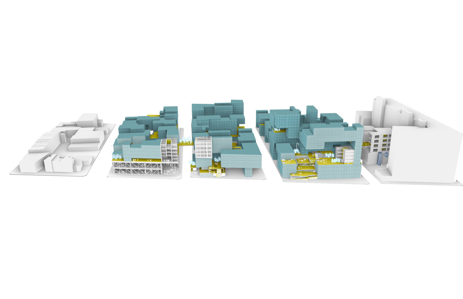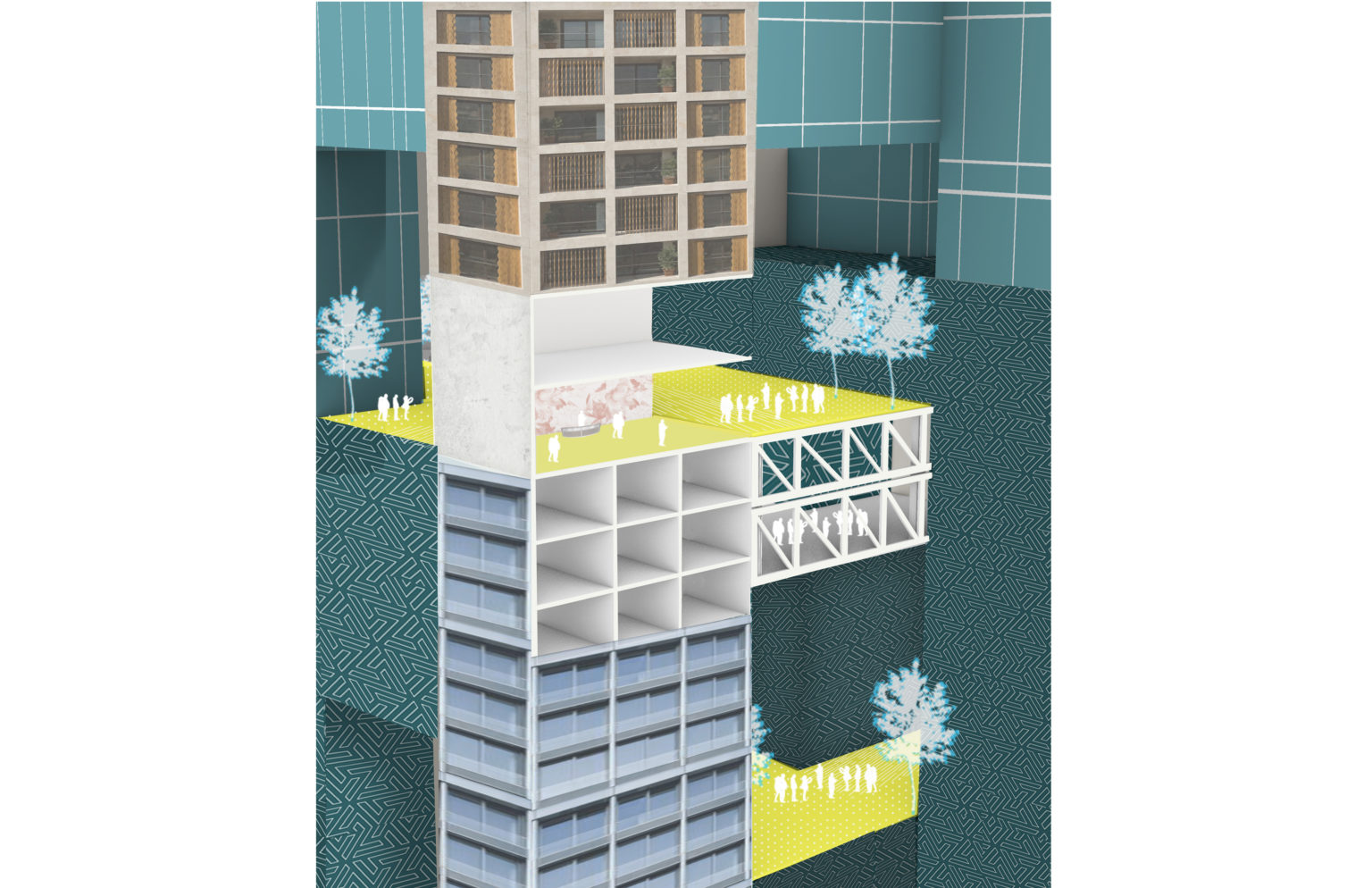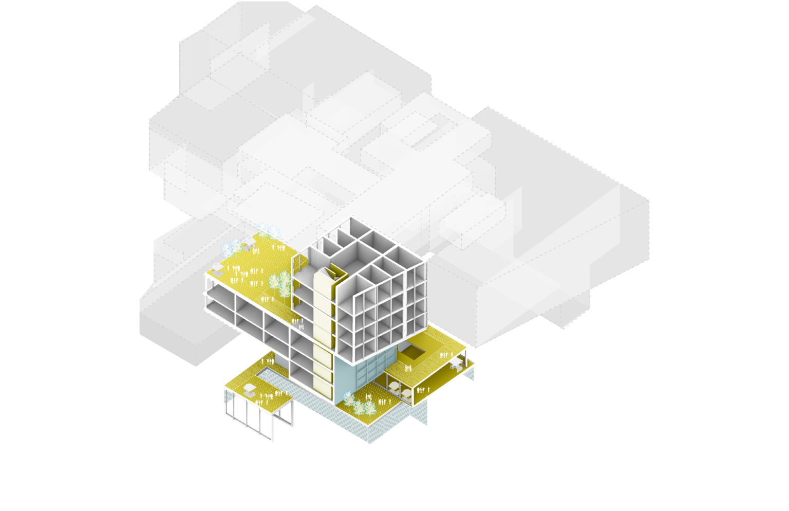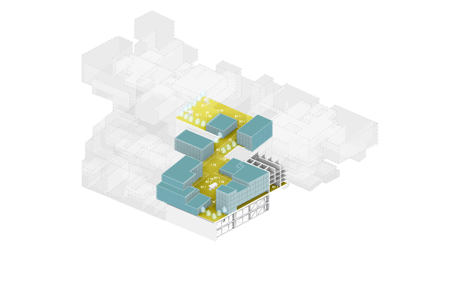 Our central circulation network is a dual use public space and circulation component. At a smaller scale these intersection volumes form public space at the scale of terraces, or small market or vendor spaces, on a larger scale they become communal farmers markets, parks, and various forms of hard