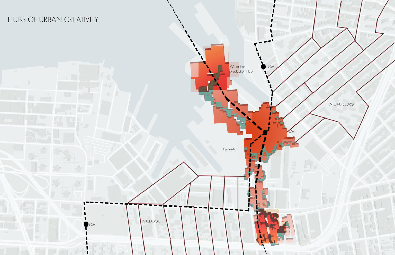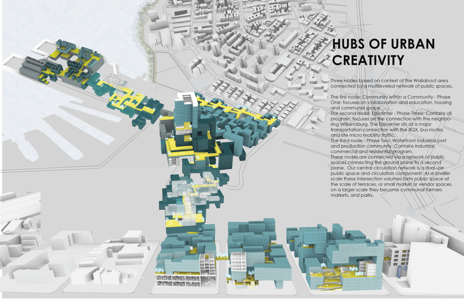Our project is about a creative community that captures the essence of Wallabout. Our project is composed of three nodes with a central circulation network that weaves through intermediary program.