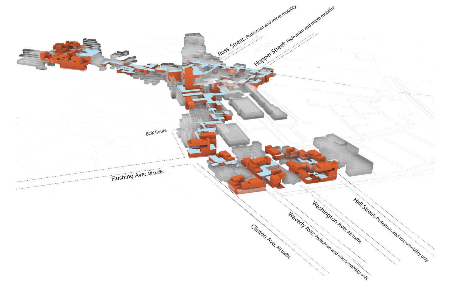The first node is located south of Flushing, in the residential and commercial blocks. This node focuses on collaboration and education by melding an interaction between public and private space, housing and communal space. The second node is called the Epicenter. This area’s main program is the science park and production factory. This area focuses on connection both to Wallabout and the neighboring Williamsburg area, infrastructural connections like the BQX and Citi bike. The third node is the waterfront production node. This area’s primary program is light industrial and commercial space.