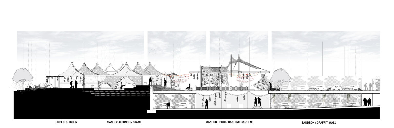 In response to these questions, we are basing our degree project in 3 locations, the corporate hub in SOMA’s Transbay Temporary Terminal, and San Francisco’s more recognizable cultural hubs in Garfield Square and Castro. We seek to connect occupants of different districts within the city through an interactive network of playscapes. These will extract physical information and actions from one place and translate them into multiple perceptions of the body in another through material landscape, sensory atmosphere, and virtual technology. We aim to stimulate non-hierarchical creative processes and collaboration between players to establish a new urban consciousness that allows leeways for interpretation, improvisation, and rebellious behavior.