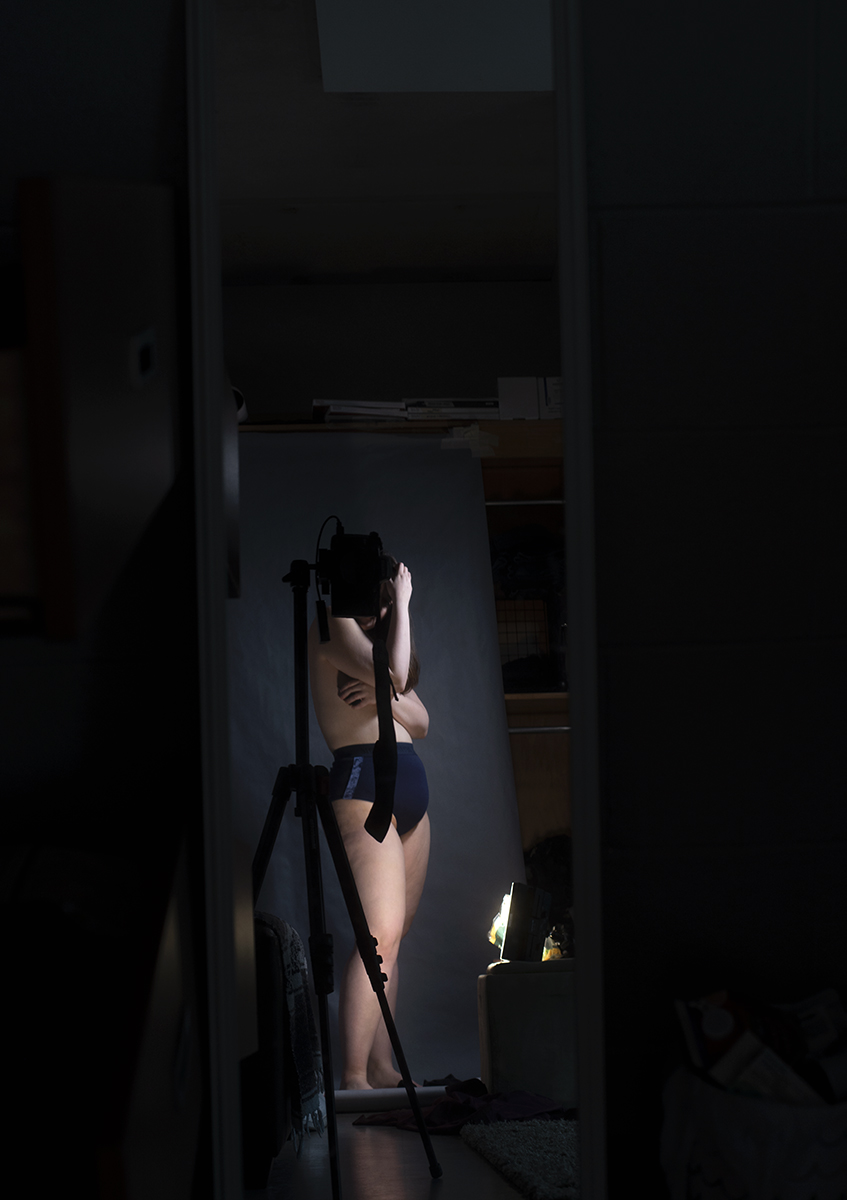 When I am in front of the camera, my body is being examined and recorded, taken apart and pieced back together through the millions of pixels that make up a digital file. Repeating the same face, the same body, the same scene over and over again to the point of obsession.