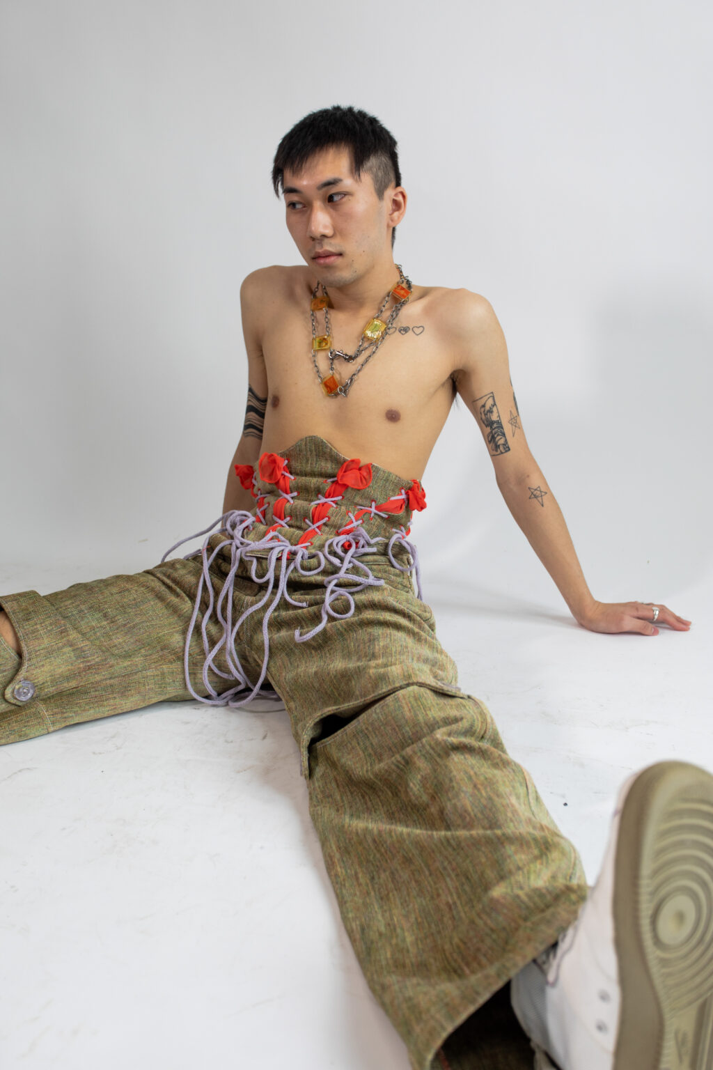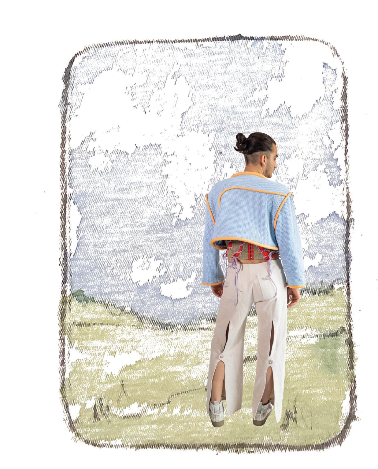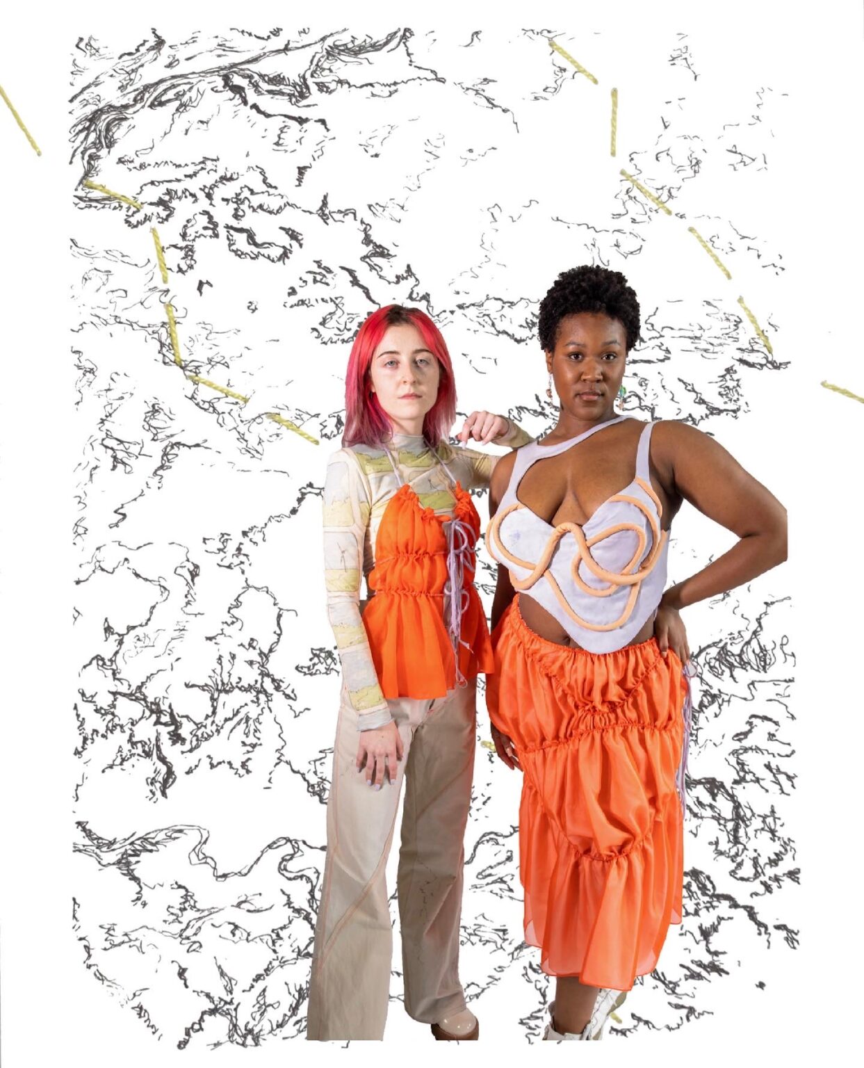 I worked my hardest to make sure this collection is as sustainable as possible, given the resources available to me. As a designer, I aspire to design for all bodies and consider the entire lifecycle of my garments. Because I strongly believe that nothing new needs to exist, I committed to only sourcing repurposed textiles(using dead-stock fabric from fab scrap and creating textiles from deconstructed second-hand garments) and using full-fashioned (zero waste) knitting techniques. All dyes used are natural, painting was done using non-toxic textile paint, and hand-made embellishments were created using (biodegradable and non-toxic) bioplastic.